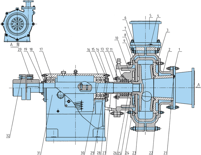 1、入口短管 2、前泵蓋 3、前護板 4、O型橡膠密封圈 5、出口短管 6、護套 7、后泵蓋 8、O型橡膠密封圈 9、后護板 10、填料箱 11、油浸石棉盤根F19 12、填料壓蓋 13、軸套 14、拆卸環(huán) 15、軸承壓蓋 16、軸承上蓋 17、向心推力球軸承 18、甩水環(huán) 19、拼冒 20、聯(lián)軸器 21、O型橡膠密封圈 22、O型橡膠密封圈 23、葉輪 24、副葉輪 25、0型橡膠密封圈 26、O型橡膠密封圈 27、調整套 28、甩水環(huán) 29、骨架油封 30、短圓柱滾子軸承 31、4號泵座 32、彈性具銷