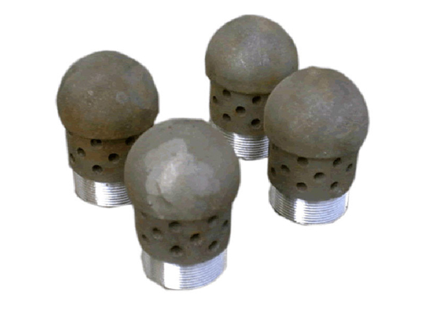 我公司生產(chǎn)的新型鐘罩式風(fēng)帽,優(yōu)于蘑菇狀多孔風(fēng)帽,蘑菇狀孔眼多,孔徑小,送風(fēng)出孔角度與帽身為90°,90°布風(fēng)在送風(fēng)風(fēng)壓波動時物料會通過風(fēng)帽孔回吸進(jìn)入風(fēng)室,造成風(fēng)室積渣,風(fēng)帽通風(fēng)不足,過熱損壞,風(fēng)帽數(shù)量多,間距小易造成風(fēng)帽間相互對吹,致使風(fēng)帽頭部磨損嚴(yán)重?fù)p壞。它同時優(yōu)于7字型和T型風(fēng)帽,其中7字型風(fēng)帽為單孔,出口角度與帽身呈90°直角或15°、30°斜角,而T型風(fēng)帽為雙孔或多孔,兩孔與帽身均呈一定角度。這兩種型號式風(fēng)帽雖然孔徑大,但無法避免對吹磨損,風(fēng)室積渣現(xiàn)象。