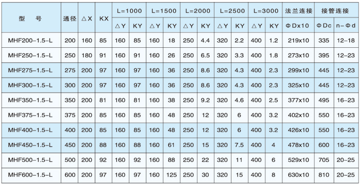 2、表中符號(hào)代表和技術(shù)參數(shù):△X:軸向補(bǔ)償量(mm); △θ:角向補(bǔ)償量(度); △Y:橫向補(bǔ)償量(mm);KX:軸向剛度(N/mm); Ky:橫向剛度(N/mm); L:產(chǎn)品總長(zhǎng)(mm);ΦDx10:接管外徑x接管厚度(表中mm),產(chǎn)品為接管連接;ΦDc:連接孔分布的中心圓直徑; n-Φd:n為連接孔數(shù),Φd為連接孔徑,產(chǎn)品為法蘭連接;